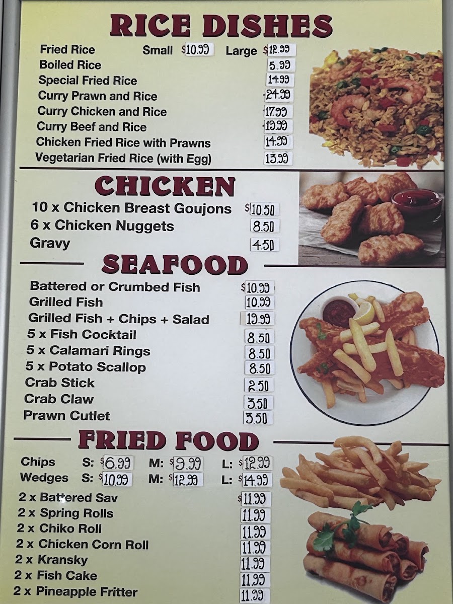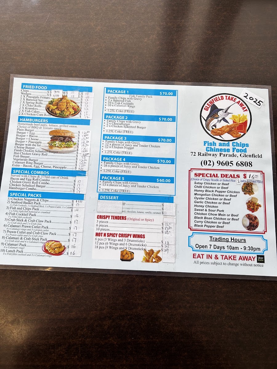 Welcome to Glenfield Chinese & Fish & Chip Shop, your go-to destination at 72 Railway Parade, Glenfield. This cozy eatery marries classic fish and chips with authentic Chinese flavors, making it a unique culinary experience. The menu boasts an array of seafood delights such as freshly grilled fish fillets, crispy calamari rings, and golden potato scallops that dance with flavor.